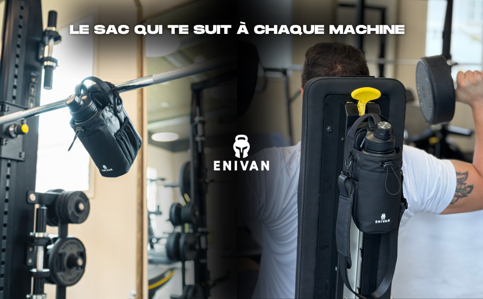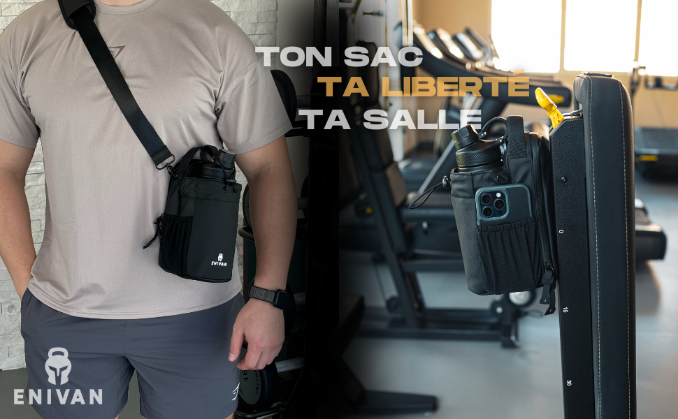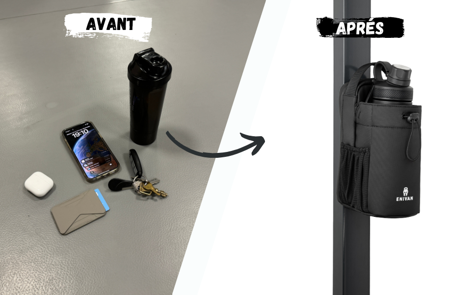 قل وداعًا للأشياء المتناثرة على الأرض. مع Enivan، يتم ربط حقيبتك بمعدات الصالة الرياضية، مما يسمح لك بإبقاء هاتفك ومفاتيحك وزجاجة المياه في متناول يدك دائمًا.